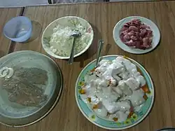 Marshallese cuisine comprises the fare, foods, beverages and foodways of the Marshall Islands, including its food-related customs and traditions.[1][2] Common indigenous and traditional foods include breadfruit, coconut, bananas, papaya, seafood, pandanus and bwiro. Additional imported foods, such as rice and flour, are also a part of people's diets and contribute to the cuisine as well. The practice of food preservation is a part of the history of the islands, and continues to occur today.