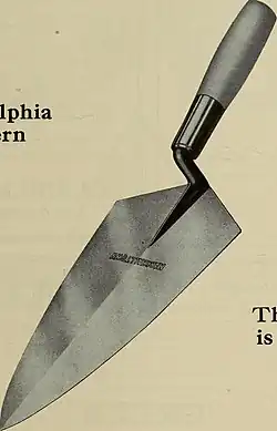Manufactured by the Marshalltown Company of Marshalltown, Iowa, the trowel was first introduced in the 1890s.[1] A patent filed for its handle by the company on July 12, 1927 was granted on December 23, 1930.[2] The Marshalltown trowel is made of a single piece of metal. The 5-inch and 6-inch pointing trowels are most often used for archaeology. It is larger and more flexible than the WHS trowel preferred by archaeologists in the United Kingdom, which makes it better for cleaning sections but less suited to digging heavy clay and gravel deposits. It is also used by bricklayers in the United Kingdom.