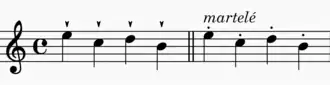 Typically, martelé is notated with triangular wedged accents, but throughout history they have been notated with combinations of staccato markings and accents, as well as implied through indications of sforzando markings.[1][5]