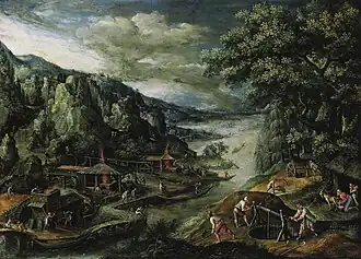 He painted, like his brother Lucas, a number of mining scenes, which were probably based on his drawings of scenes along the Meuse river valley around present-day Huy in Belgium. There he had likely witnessed and sketched mining activities related to the iron industry. Some of his paintings of mining scenes such as River valley with iron mining scenes provide detailed depictions of the mining and smelting process of the late 16th and early 17th century.[10][11]