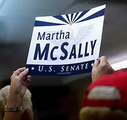 McSally was expected to run as the establishment candidate in the Republican primary, where her opponents included former state senator Kelli Ward and former Maricopa County Sheriff Joe Arpaio.[43] McSally, a strong fundraiser, was the preferred candidate of national Republicans and Arizona Governor Doug Ducey. McSally's history of criticizing President Donald Trump drew rebuke from conservative groups including the Club for Growth, the Senate Conservatives Fund, and FreedomWorks.[44] McSally had previously distanced herself from Trump, choosing not to endorse him in 2016 and calling his comments about sexual assault "disgusting" and "unacceptable."[45] But in the lead-up to announcing her candidacy for Senate, McSally began to embrace Trump, running ads echoing his conservative immigration policy positions.[46] Politico wrote: "Martha McSally wants to make one thing clear before she launches an Arizona Senate campaign: She's a big fan of President Donald Trump."[47]