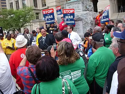 On April 4, 2011, the 43rd anniversary of the assassination of his father, King helped to lead nationwide demonstrations against initiatives to eliminate and undermine the collective bargaining rights of public workers in Wisconsin and other states. King led a mass march in Atlanta and spoke to a crowd of supporters at the Georgia state capitol, urging them to "defend the collective bargaining rights of teachers, bus drivers, police, firefighters and other public service workers, who educate, protect and serve our children and families". On November 17, 2011, King and AFL–CIO President Richard Trumka co-authored an article for CNN, calling for reforms to end oppressive immigration laws.[44]