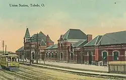 A union terminal, built in 1886 in the Gothic style, served several of the major rail lines passing through Toledo. Tenant railroads included the Baltimore and Ohio Railroad (B&O); the New York Central Railroad and its subsidiaries, the CCC & St.L. (Big Four Railroad) and the Michigan Central Railroad; the Pere Marquette Railroad; and the Wabash Railroad. The station caught fire in 1930 but remained standing. The damage was later repaired and service resumed.[2]