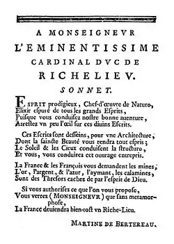 Sonnet dedicated to Cardinal Richelieu written by Martine Bertereau in her book The Return of Pluto, 1640.