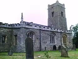 In the centre of the village stands the church of St Margaret. The building is essentially of the Norman Conquest period, built using a mixture of Anglo-Saxon and Norman styles.[4] Much of the work of these periods is still retained. It has an 11th-century tower[5] of herringbone masonry, a Saxon cross shaft set in an outer wall and an ancient carved crucifix within. The tall cross in the churchyard is used as a war memorial and it is thought to be a former Medieval market buttercross.