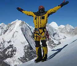 Schmidt climbed and guided in the mountains of Europe, South America, Africa and the Himalayas.[1][8] His first high altitude ascents on Denali in Alaska were from 1983 to 1986. Schmidt acted as an assistant guide on Aconcagua in Argentina in 1988, before creating his own company and guiding in the Andes as MSIG (Marty Schmidt International Guiding). He made his first ascent of Mount Cook in New Zealand in November 1988. In the Himalayas, Schmidt attempted to climb Mount Everest in 1994 and 2008. He summited Kangchenjunga in 2001, and summited Cho Oyu in 2001, 2004 and 2009. In the Karakoram, he made unsuccessful attempts on K2 in 1992 and 2000, and summitted Gasherbrum I and Gasherbrum II in 2010.[8] In the 2010 Himalayan climbing season, Schmidt became the third New Zealander to summit Makalu solo and the first to do so without bottled oxygen. Schmidt summitted Ama Dablam and attempted Lhotse in the same season.[8] Schmidt led two successful expeditions to Mount Everest guiding for the Canada-based company Peak Freaks in 2012 and 2013. In 2012, he became the oldest New Zealander to summit Everest at the age of 51.[1] He summitted Everest again in May 2013.
