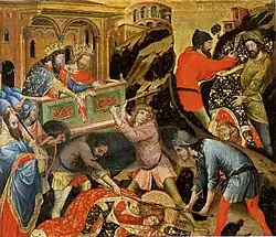 The Martyrdom of Saint Sebastian (Italian: Martirio di San Sebastiano or Italian: Saettatura di San Sebastiano), once part of the Saint Sebastian altarpiece, is a tempera on wood panel painting by Nicolò Semitecolo dated to 1367 on one panel. The painting is now in the Diocesan museum of Padua, Italy together with six other panels from the same artist. Before being separated, all were part of a large altarpiece or other group piece in Padua Cathedral. The initial arrangement of the panels within the altarpiece was not recorded, and is still being debated among scholars.[1]