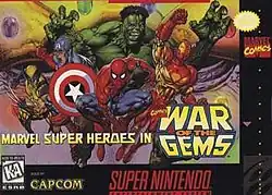 Marvel Super Heroes in War of the Gems (マーヴルスーパーヒーローズ ウォーオブザジェム, Māvuru Supā Hīrōzu: Wō obu za Jemu) is a 1996 beat-'em-up platform game developed by Capcom for the Super Nintendo Entertainment System, based on the events of Marvel Comics' series The Infinity Gauntlet and The Infinity War. In the game's plot, Adam Warlock calls upon Earth's greatest superheroes to seek out the Infinity Gems before they fall into the wrong hands.