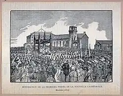 Work began in 1875 and the new church was consecrated in 1894 as Saint James Cathedral,[1] after Saint James the Great, the patron of the parish the church served. At the time it was the largest church in Quebec. It was made a minor basilica in 1919 by Pope Benedict XV. It was rededicated in 1955 to Mary, Queen of the World, by Pope Pius XII at the request of cardinal Paul-Émile Léger. (The pope had proclaimed this title for Mary in his 1954 encyclical Ad caeli reginam.)
