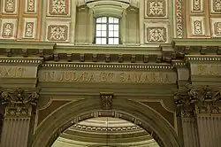 - At the base of the cupola: This text is fragmented into four physical sections. It is based on Revelation 4:8 from the Apocalypse and dedicated to the glory of God: "Holy, Holy, Holy, the Lord, who is, who was, and who is to come." (Latin: "Sanctus sanctus sanctus Dominus qui erat qui est qui venturus est.")