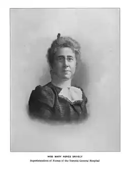 Mary Agnes Snively was born in St. Catharines, Canada West, to Martin Snively, born in Upper Canada, and Susan Copeland, born in Ireland.[1] She was Lady Superintendent of Nurses at the Toronto General Hospital's School of Nursing from 1884 to 1910, where she established the first nursing student residence and a proper curriculum.[2]
