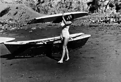 ![]() Mary Ann Hawkins carrying her surfboard in Bluff Cove, Palos Verdes, originally published in Life Magazine. | |