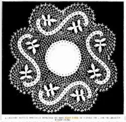 Mary was a particularly prolific and versatile designer. The series of spreadsheets describing her more than 400 designs show the broad scope of her work and assist in finding particular patterns.[21] Her best work was in filet or picture crochet. Her large flowing ‘big picture’ afternoon teacloths, with living creatures enhanced by lacet backgrounds have few if any rivals.[22] She was an excellent teacher of many good techniques.[23][24] Mary enriched the lives of women across the world with her delightful crochet lace designs from the early 1900s until the late 1930s. At a time when women were full-time homemakers, making crochet lace was an important part of many women's lives in a way that may be hard to understand today. Needlework was an enjoyable, fashionable and socially correct pastime. Women were proud to wear and decorate their homes with the finished items.[25] Mary was more than a remarkable designer. She was also a hard-working, warm-hearted, clever, spirited, enterprising and resilient woman. She was an active Secretary of her district's Patriotic League during World War I.[26] She also helped people with speech and hearing difficulties before she closed her school.[27]