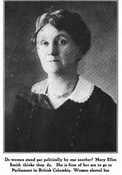 - ^ a b "Mary Ellen Smith: First Female Member of the Legislative Assembly of British Columbia" (PDF).