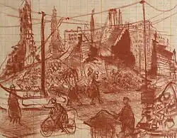 During the end of the Second World War, Kessell was based in Germany having been commissioned by the War Artists Advisory Committee, WAAC, as an official British war artist.[2] Just three female war artists worked abroad during World War II; as one of them, Kessell was asked to document refugees "moving through Europe in the aftermath of the German surrender".[3][7] She spent six weeks in Germany, from 9 August 1945 to 20 September, where she made charcoal drawings of refugees as well as keeping a diary of her experiences.[2][8][9]