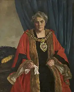 At the end of her term, she was promoted to become a Commander of the Order of the British Empire (CBE). A painting paid for by fifty women's groups was commissioned.[1] In 1958, she was promoted to Dame Commander of the Order of the British Empire (DBE). She retired from the council in 1966 and was made an honorary alderman the following year.[2][3]