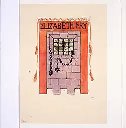 Between 1903 and 1914, the methods used by the women's suffrage movement began to change and they began to engage in public demonstrations and other propaganda activities. Lowndes' training as an artist and stained-glass designer encouraged the use of bold shapes and a love of full, rich colours, using striking combinations of green and blue, magenta and orange.[7] She wrote a guide in 1910 to help women create their own Banners and Banner-Making, saying of the suffrage banners: "you do not want to read it, you want to worship it. Choose purple and gold for ambition, red for courage, green for long-cherished hopes ... It is a declaration." Such banners were designed with female images like flowers, lit lamps, shells, sunrays, winged hearts; and to honour female heroines like Boadicea, Elizabeth Fry, Florence Nightingale, Marie Curie, Josephine Butler, Jane Austen, Mary Wollstonecraft, Charlotte Brontë and even 'Victoria, Queen and Mother'. These were carried in their hundreds or thousands in London's Pageant of Great Women 1909, Hyde Park Rally 1910, From Prison to Citizenship 1911, Pilgrimage for Women's Suffrage 1913, and later that year at the grand funeral procession of Emily Wilding Davison, the suffrage movement's martyr who threw herself under the King's horse at the Epsom Derby.[8][6] An album of Lowndes' original banner designs (detailed on paper in watercolour and often accompanied by fabric swatches) resides at the Women's Library at the London School of Economics.[9]