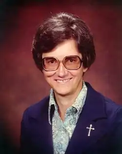 After completing her novitiate, she was sent to teach in American, Irish, and French schools in Neuilly, a suburb just outside Paris. During this time, she also earned a Ph.D. in English at the L’Université de Paris (1959).[1] After completing her doctorate, she returned to the U.S. and began teaching at Loyola Marymount University, but visited France again in 1960 before taking her final vows in California.[2] In 1966, she earned an MA in sacred scripture from St. Mary's College in Indiana, which was the first Catholic college in the U.S. to offer advanced degrees in theology to women.[1][6]