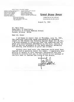 1991 letter addressed to Mary Koss by Joe Biden, then Chairman of the Senate's Committee on the Judiciary