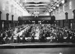 Internally this front section houses offices, meeting rooms, a large stair hall and entrance hall to the auditorium. The entrance hall provides access to the auditorium and other hallways through a series of double timber doors, some with arctic glazed panels and all surmounted by operable transom windows. A bifurcating concrete stair commences on the two sides of the entrance hall and meets at a landing above the entrance door, proceeding for another flight to the first floor level. At the first floor the stair hall has a painted pressed metal ceiling. Access is provided from the stair hall on this level to the Council Chamber and a large meeting room. As this area was subject to a damaging fire, much of the interior has been refitted, in the case of these rooms with a reconstruction of what was originally built. The Council Chamber has a barrel-vaulted plaster ceiling and is lined with timber wainscotting to about 2,500 millimetres (98 in).[1]