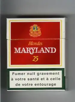 ![]() An old Luxembourgish pack of Maryland cigarettes, with a health warning in French at the bottom of the pack. | |