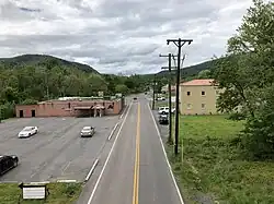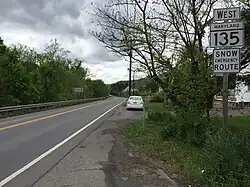 MD 135 heads straight southeast toward a grade-separated crossing of CSX's Mountain Subdivision railroad line very close to the railroad's crossing of the Eastern Continental Divide. The state highway curves to the northeast and gently ascends Backbone Mountain. A scenic overlook marks the highest point on MD 135 at 2,969 feet (905 m) shortly before the intersection with MD 38 (Kitzmiller Road).[1] The state highway continues northeast along the ridgeline through Potomac-Garrett State Forest and intersects Swanton Road and a few roads on the south side of the highway that access Jennings Randolph Lake. Upon leaving the state forest, MD 135 begins to pass scattered residences ahead of the descent of Backbone Mountain, which has grades as steep as 9%. Trucks are required to stop at three different brake check locations and obey a posted speed limit of 10 mph (16 km/h).[3] After Bloomington Hill Road splits to the north and the state highway passes the third brake check stop, a runaway truck ramp splits to the south.[1] The downhill grade eases as MD 135 enters Bloomington, where the name of the highway changes to Bloomington Road. After passing through residential areas, the state highway crosses the Mountain Subdivision and the Savage River before meeting Savage Hillside Road at a T intersection in front of Franklin Hill.[1][2]