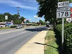 MD 178A is the designation for a 0.28-mile (0.45 km) old section of Generals Highway next to the state highway's northern terminus near Millersville. The highway forms a curve east of the junction of MD 178 and Veterans Highway that intersects both highways on a tangent. MD 178A is two lanes and lined with houses except for a pair of one-way northbound segments on both ends.[1][18] MD 178A follows what was originally the northernmost portion of MD 178 to meet what is now Veterans Highway at an acute intersection at Dorrs Corner.[19] MD 178 was relocated to its present perpendicular intersection with Veterans Highway by 1978.[20]