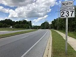The original MD 237 roughly followed what is today MD 234 between Chaptico and MD 5 near Leonardtown via Clements.[3] The modern MD 237 was designated along what had been county-maintained Chancellors Run Road around 1987.[4] By 2003, heavy traffic along MD 237 related to greater activity at NAS Patuxent River led to the highway being marked for expansion.[5] Between 2008 and 2010, MD 237 was expanded from a two-lane undivided road to a four-lane divided highway from Pegg Road to MD 235. The speed limit on the road increased from 40 mph (64 km/h) to 45 mph (72 km/h) in 2015 [6]