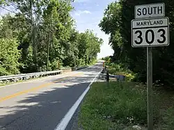 Maryland Route 303 (MD 303) is a state highway in the U.S. state of Maryland. The state highway runs 4.20 miles (6.76 km) from MD 309 in Cordova north to MD 404 in Queen Anne. MD 303 is an reverse L-shaped highway that passes through the northeast corner of Talbot County and the southeast corner of Queen Anne's County. The state highway also passes very close to the birthplace of Frederick Douglass. MD 303 was originally designated along Starr Road between Queen Anne and U.S. Route 213 (US 213) south of Centreville, while present MD 303 is part of the old alignment of MD 309. The original MD 303 was constructed in the late 1920s and early 1930s, with a gap near Starr filled in the late 1940s. MD 309 absorbed MD 303 in 1955. MD 303 was assigned to its present course in 1961.
