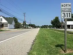 MD 311 was constructed in its modern form in 1924.[3][4] At the time, the state highway turned east onto Main Street in Marydel and followed it to the Delaware state line.[4][5] By 1946, MD 311's northern terminus was rolled back to Main Street and MD 454 headed to the state line instead.[6] MD 311 was widened along its entire length in 1952.[7] The state highway was extended a short distance to its present northern terminus when MD 454 was transferred to a new alignment in Marydel in 1956.[8]