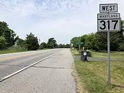Maryland Route 317 (MD 317) is a state highway in the U.S. state of Maryland. Known as Burrsville Road, the state highway runs 4.78 miles (7.69 km) from MD 313 in Oil City east to the Delaware state line in Burrsville, where the highway continues east as Delaware Route 14 (DE 14). MD 317 was constructed in the mid-1920s and realigned through Burrsville around 1960.