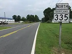 Maryland Route 335 (MD 335) is a state highway in the U.S. state of Maryland. The state highway runs 16.36 miles (26.33 km) from the upper end of Hooper's Island north to MD 16 in Church Creek. MD 335 provides access to several communities along the Honga River in southern Dorchester County. The state highway also passes through Blackwater National Wildlife Refuge. MD 335 was designated as one of the original state roads, but only the portion of the highway from Crossroads to the Blackwater River was completed by the early 1920s. The highway was constructed from Crossroads to Golden Hill in the mid-1920s, from Crossroads to Church Creek in the late 1920s, and from Golden Hill to Hooper's Island with the completion of a modern bridge over Fishing Creek in 1934.