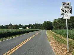 Maryland Route 388 (MD 388) is a state highway in the U.S. state of Maryland. Known for most of its length as West Post Office Road, the state highway runs 2.38 miles (3.83 km) from MD 675 in Princess Anne east to the end of state maintenance east of Princess Anne. MD 388 was constructed in the early 1930s.