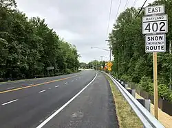 MD 402 was constructed as a gravel road from MD 2 in Prince Frederick, which originally followed Armory Road, to Wilson Road near Dares Beach in 1932.[3][4] When MD 2 was relocated on the north side of Prince Frederick around 1942, MD 402 was extended south along Armory Road to Main Street (then MD 2, now MD 765).[5][6] The portion of Armory Road north of MD 402 was designated MD 750.[7] In 1957, the state highway was extended east from Wilson Road to Dares Beach using what is now MD 768. MD 402 was removed from Armory Road the same year when the road was transferred to county control.[8] The state highway was reconstructed with a wider bituminous concrete surface starting in 1957 from the Prince Frederick end.[9] The reconstruction was completed in 1959, the same year the highway was extended to its present western terminus at MD 2.[10] MD 402 was rerouted to its present eastern terminus in 1960.[11]