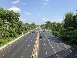 Expansion of MD 586 to a four-lane divided highway began in 1954. The first segment of the expanded highway, from just east of MD 28 in Rockville to Turkey Branch, was started that year and completed in 1956. This work included widening and reconstructing the route's bridge across Rock Creek.[10] MD 586 was expanded to a divided highway from Turkey Branch to MD 97 between 1955 and 1957.[10][11] The westernmost segment of the highway at the MD 28 intersection was expanded to a divided highway shortly after the completion of MD 28's modern bridge across the railroad in 1981.[12][13] The pedestrian bridge that carries the Rock Creek Hiker-Biker Trail across MD 586 was constructed starting in 2008 and opened in 2011.[14]