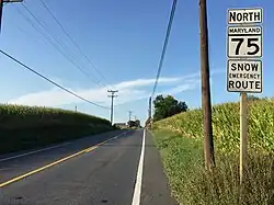 | Carroll | Union Bridge | 24.08 | 38.75 | Main Street north – Middleburg | MD 75 turns east onto Green Valley Road |