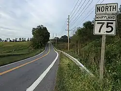 Maryland Route 75 (MD 75) is a state highway in the U.S. state of Maryland. Known for most of its length as Green Valley Road, the state highway runs 28.40 miles (45.71 km) from MD 355 near Hyattstown north to MD 31 in New Windsor. MD 75 serves as the main north–south highway of eastern Frederick County, where it connects Hyattstown with New Market, Libertytown, Johnsville, and the Carroll County town of Union Bridge. The first sections of MD 75 were constructed around New Windsor and between Green Valley and New London in the early 1910s. The latter highway was extended south to Green Valley in the late 1910s. In the early 1920s, MD 75 was constructed between New Windsor and Union Bridge and from Libertytown to Johnsville. The remainder of the state highway was constructed in the late 1920s and early 1930s. MD 75 was relocated between Union Bridge and New Windsor in the early 1960s, around its interchange with Interstate 70 (I-70)/U.S. Route 40 (US 40) in New Market in the early 1970s, and at its northern terminus in New Windsor in 2007.