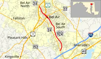 Maryland Route 924 (MD 924) is a state highway in the U.S. state of Maryland. The state highway runs 7.39 miles (11.89 km) from MD 24 near Emmorton to U.S. Route 1 (US 1) and MD 24 in Bel Air. MD 924 is the old alignment of MD 24 through the Bel Air area in central Harford County. The state highway was originally constructed in the late 1920s and early 1930s. MD 924 was assigned when MD 24 was moved to a new divided highway to the west in 1987.
