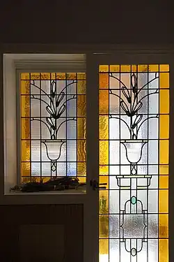 The dining room was the scene of all the family celebrations. In this room, Masó was best able to express the noucentista concept of the home as an austere but comfortable place, a harmonious whole with great attention to detail, of humble traditional appearance but filled with cultured references. Outstanding features include objects designed by the architect, in particular the hanging lamp, the stained glass, the sideboard, and the cabinet, as well as the Woman with bundle (ca 1906) figure by noucentista sculptor Enric Casanovas.