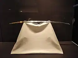 A peculiar work of Masamune, once in the possession of the Tokugawa Shogunate through the Kii Domain and gifted to the main Tokugawa family line in Edo in its prime.[39] It is designated as an Important Art Object.[40] Upon the end of the Tokugawa Era marked by the Bakumatsu, the Musashi Masamune was presented as a gift by Tokugawa Iesato in honor of Yamaoka Tesshū's efforts to facilitate peaceful negotiation with Katsu Kaishū to Saigō Takamori, sparing Edo from war and needless destruction; however, Yamaoka was humbled upon being given such a masterpiece, and had passed it down to statesman Iwakura Tomomi. Soon after seeing it passed from hand to hand throughout the 20th Century, the Musashi Masamune finally made its way to the Nihon Bijutsu Token Hozon Kyokai in the year 2000 by Motoo Otsuyasu. The Musashi Masamune is a tachi, measuring 74 cm (2 korai-shaku, 1 sun, 4.2 bun) and noted to have nearly all of the characteristics of Masamune's signature features; though it is debated that its o-kissaki is not that of his style, it is compared to blades made in his later career, which shows the transition of the Kamakura styles into the Nanbokucho era. It is rumored that, while the blade is named after Musashi Province, where Edo and current day Tokyo stands, its origin stems from being once in the possession of Miyamoto Musashi, who is considered Japan's most famous swordsman. The sword is classified as a meibutsu.