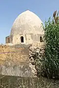 The mausoleum has an area of 600 square metres. The mausoleum is located on the northeastern side. To the left of it is a well for ablutions, located inside a domed building constructed in the late 19th century.[1][7] Inside the mausoleum, there are six rooms, each containing a tomb of a member of the Tabataba family.[7] On the western side of the interior is the door to a small prayer hall. The prayer hall is square and each side is 18 metres long.[9] It is divided into three sections by two rows of perpendicularly attached pillars.[9] Nine domes were used to top the structure, but there are only three remaining.[8]