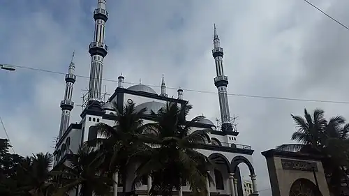 The mosque sits on the corner of a traffic intersection on a popular thoroughfare of southern part of the city. Prestige Group developers undertook the construction which began in 2010 and was completed recently.[1] At that time Janab Alhaj Habeeb Khan Saheb was president of this committee from 2004 to 2015. The mosque constructed at a cost of Rs. 200,000,000 provides space for 6,500 people to pray at a time. A considerable portion of the cost was contributed by the Prestige Group.