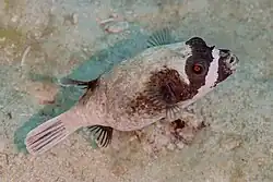 Maximum length 30 cm, olive-green/grey with a black mask over the eyes and pectoral fins, mouth has a black border.[2] Usually solitary but schools during mating period. Some authors believe this to be a variation of the species Arothron nigropunctatus.[3]