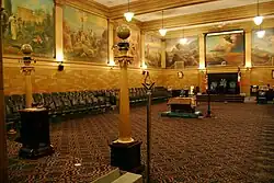 The six stories are divided into three main levels, each with a corresponding mezzanine above it. The first level originally contained a banquet hall and 1,600-seat auditorium, which were intended for use by the community. The second and third levels featured ceremonial meeting rooms reserved for Masonic lodges and appendant organizations that included the York Rite (Royal Arch, Cryptic Masons, and the Masonic Order of the Knights Templar), Order of the Eastern Star, DeMolay for boys, and Job's Daughters for girls. A large assembly hall on the third floor was designed so that the marching drill teams of the Knights Templar could practice their maneuvers indoors during inclement weather.