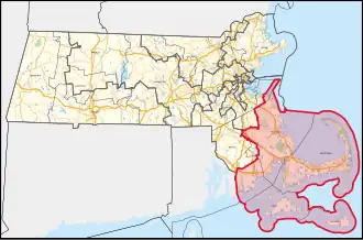 1953: "Counties: Barnstable, Dukes, and Nantucket. Bristol County: City of Fall River, ward 6, and city of New Bedford; towns of Acushnet, Dartmouth, Fairhaven, and Westport. Norfolk County: Town of Cohasset. Plymouth County: Towns of Abington, Bridgewater, Carver, Duxbury, East Bridgewater, Halifax, Hanover, Hanson, Hingham, Hull, Kingston, Lakeville, Marion, Marshfield, Mattapoisett, Middleborough, Norwell, Pembroke, Plymouth, Plympton, Rochester, Rockland, Scituate, Wareham, West Bridgewater, and Whitman."[10]