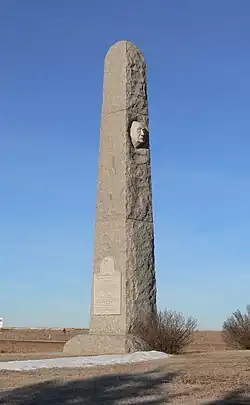 The Massacre Canyon Monument was dedicated on Sept. 26, 1930. It was the first historical monument erected in Nebraska by federal grant. It stands on a three-acre (1.2 ha) plot, three miles (4.8 km) east of Trenton off U.S. Route 34, after having been moved from its original location overlooking the Republican River valley. The monument, a large stone obelisk,[33] was constructed from Minnesota pink granite from a quarry in St. Cloud by R.P. Colling, Indianola, Nebraska.[34] The shaft of the obelisk is 35 feet (11 m) high. The base measures 9 feet (2.7 m) by 9.5 feet (2.9 m) across; the bottom of the shaft is five feet (1.5 m) across, tapering to 32 inches (81 cm) near the top. The entire monument weighs 91 tons (83,000 kg).