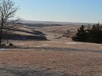 Massacre Canyon is the large canyon about half a mile west of here. The battle took place in and along this canyon when a Pawnee hunting party of about 700, confident of protection from the government, were surprised by a War Party of Sioux. The Pawnee, badly outnumbered and completely surprised, retreated into the head of the canyon about two miles northwest of here. The battle was the retreat of the Pawnee down the canyon to the Republican.