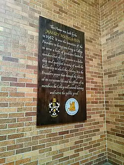 Opened officially in 1963, the college was designed by Canadian architect Ron Thom, who subsequently designed the master plan for Trent University. Alan Beddoe designed the Massey College coat of arms,[3] which derives from the arms of Vincent Massey.[4]