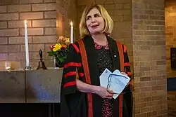 St. Catherine's became Canada's third chapel royal in Canada on 21 June, National Indigenous Peoples Day, 2017,[9][10] in recognition of the sesquicentennial of Canada, the relationship between Massey College and the Mississaugas of the Credit First Nation,[9] and as a gesture of reconciliation. The Chapel acknowledge the history of the Royal Proclamation of 1763 and its ratification by the Treaty of Niagara in 1764.[10] It is the first interdenominational and interfaith chapel royal[11] and the only one with its own title in an Indigenous language.[12]