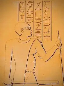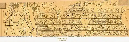 Tomb owner leaning comfortably on the staff watching the work in the field, behind him stays his brother Iteti[note 3], next to him is his dog, in front of him a servant shielding with a large umbrella. On the right are six registers of images. From above seen rowing and sailing boats, in next is piling up the grain stacks, dragging away the sheaves, donkeys threshing grains, throwing up the stacks, celebrate up stele of the harvest goddess. Scriber handing over the list settling accounts with the shepherds, on the right are the grain harvest which the owner of the tomb is watching. The first holding open papyrus is the Khafraanch's son Khafrauserkau and his brothers Khafraankh and Neferkau typing behind him.[8] On the right sheavs are tieding up in sacks, settling accounts with the shepherds, on the right birds are catching with a dragged net, behind this seen the gutting and carrying away of the fish.